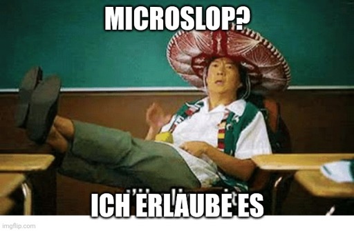 Bildbeschreibung: “I’ll allow it” meme (https://knowyourmeme.com/memes/senor-changs-ill-allow-it) Oben Text: Microslop? Unten Text: ich erlaube es