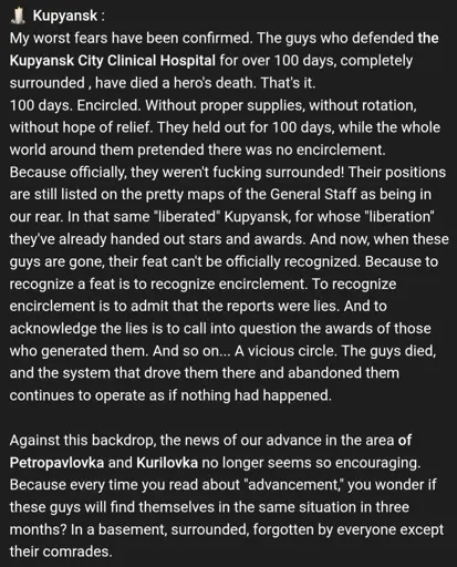 Thats pretty brutal. Putin is well on his way to being considered the greatest villain of the 21st century with his complete lack of concern over loss of human life. I do feel sad for a lot of these young men who think they are doing something heroic, when really they are dying for the vain ambitions of a dictator cowering in a bunker in Moscow.