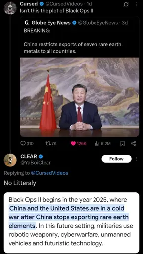 Dear gods. Without rare earth metals the US could regress technologically. We’d likely revert to cathode ray tubes and other post WW2 tech. That is until fusion is sustainable and then we get fight over energy for some reason. Next thing you know it’s October 23, 2077…