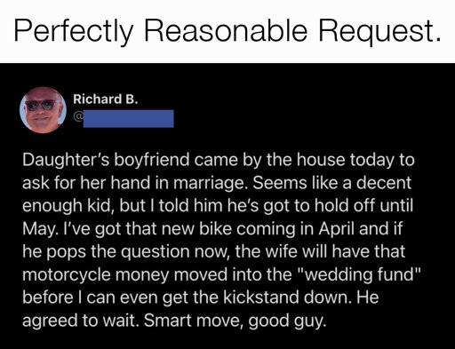 Good for you. But whenever I hear about asking for the “parent’s” permission, 99 times out of 100 it’s the father they’re asking.