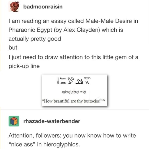 Fun fact. Hieroglyphs can be written left-to-right or right-to-left. You have to distinguish the direction they should be read by the facing of the animal/creature/human used as a character. They will always “look” towards the beginning of the sentence, so in the depicted case, the intended direction is left-to-right.