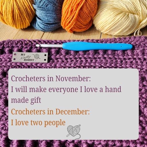 A picture of a crocheted piece made with purple yarn, above it are some colorful yarn balls. The caption reads “Crocheters in November: ‘I will make everyone I love a hand made gift.’ Crocheters in December: ‘I love two people’