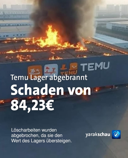 Ein Lager von Temu, einem digitaler Ramschladen, ist abgebrannt. Üblicherweise entstehen bei Lagerbränden Schäden in Millionenhöhe, aber nicht hier, weil Ramschladen. Ist das nicht offensichtlich?
