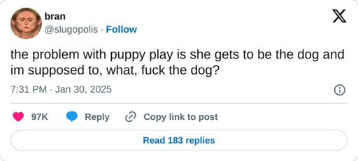 First read through, I thought ‘puppy play’ meant literally playing with your puppy.