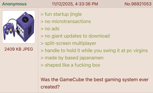 arrow-up1580arrow-down1imageAnon remembers the GameCubesh.itjust.works🍹Early to RISA 🧉@sh.itjust.worksM to Greentext@sh.itjust.works · 17 days agomessage-square131linkfedilink