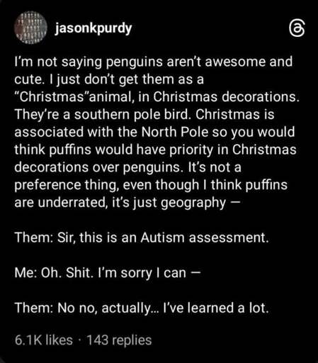 Where it goes wrong is using it as an identity outright. “Sorry, I’m autistic” is just fucking more annoying after someone does something annoyingly autistic. Being autistic doesn’t mean you literally cannot learn good social behavior. By the time that is true, there is definitely something more serious than autism involved.