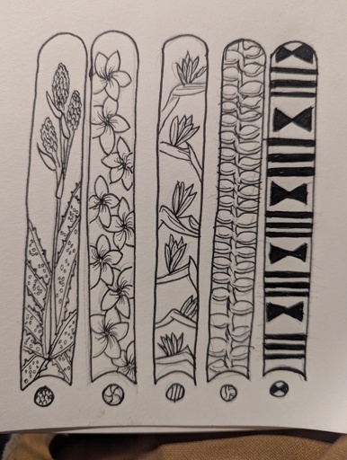 Which one of these is the best? See my prior post for the space this needs to fit in. But the basics are “Mucha style framing fill motif” with a tropical theme. I am leaning towards one of the first two. But if you have a different idea please draw it up and present it.