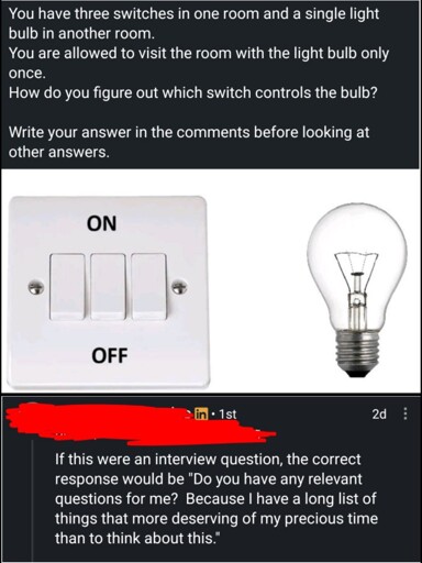 Of course, if I encountered this problem in real life, I’d ask Carol from accounting to check the other room, while I flip the switches. But my instinctive answer was that it is not possible, because I assumed it to be a riddle and the provided rules did not allow a solution.