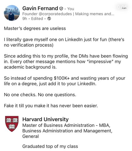 He’s talking about an MBA, not an actual degree.