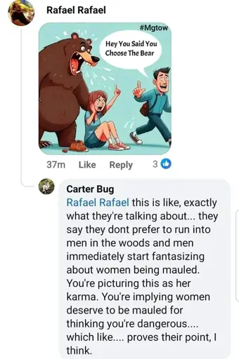 The question was “would you rather be alone in the woods with a man or a bear”, right? Is this not the logical conclusion of the bear option? Like, I very much agree this is bad hearted revenge fantasy but this is the logical conclusion of choosing the bear. They’re not cuddly.