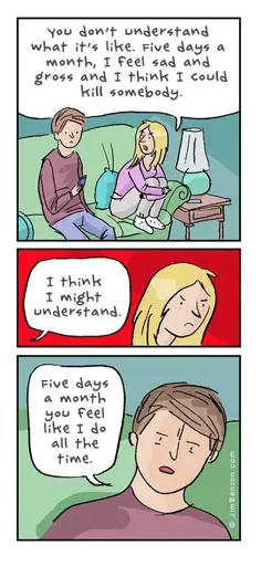 I have a friend that like me has had medical issues arise because of their cycle, and though we’ve had similar experiences I am least likely to bring up my experiences when she’s talking about hers because I want to give her feelings as much space as possible. She does the same with me. I’m not sure if it’s like that for others, but I think the more severe the issue the more likely I am to verbalize sympathy than empathy. On the other hand, I can pretty casually talk about it with some friends who have a more average experience with them. I’m least likely to talk about it with my male friends, but I have some close ones that I will mention it to and they always step up their support if I bring it up, since I mostly bring it up if I’m noticing I need some extra support. Because of the way my cycle affects me, and maybe because I am really lucky, my partners have been mostly really good about recognizing it and offering support when needed.