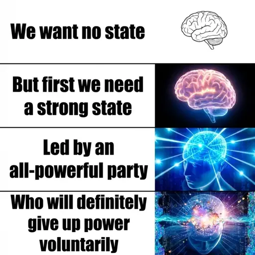 The withering of the state as a concept is a foundational part of ML theory and it does seem as though you’re being intentionally obtuse. I don’t think you would run into a ton of people who believe that OPs meme is an implausible situation as this is the exact reason continuous revolution exists as a concept. The transitional state has to be scrutinized so as not to become a tool of bourgeois capitalism once more.
