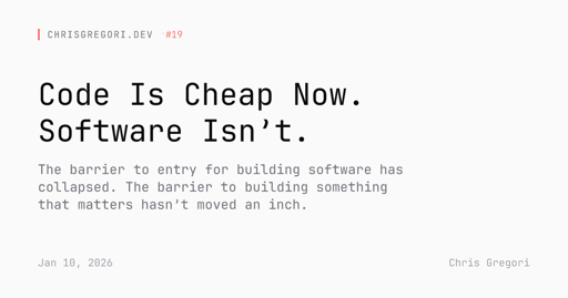 arrow-up113arrow-down1external-linkCode is cheap now, but software isn'twww.chrisgregori.devRSS Bot@lemmy.bestiver.seMB to Hacker News@lemmy.bestiver.seEnglish · 17 days agomessage-square1linkfedilinkfile-text