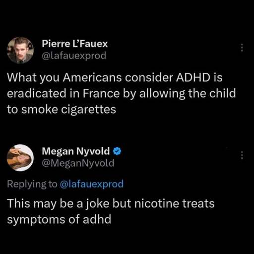 Edit: yes, thank you all for adhdsplaining stimulants to me. I know about speed and caffeine. I was simply asking about nicotine.