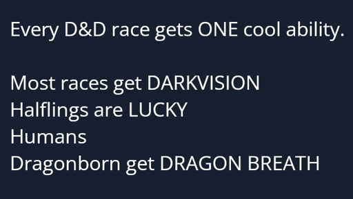 arrow-up11arrow-down1imageEvery race gets one cool abilityaussie.zoneDefenestrator@aussie.zone to RPGMemes @ttrpg.network · 2 years agomessage-square4linkfedilink