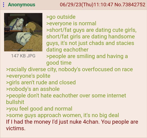 Compare LA to Phoenix AZ and you go from the description of all the things the green text says are aren’t true to them being reality. 4 Chan is probably filled with people from conservative shitholes hating life because they live in a conservative shithole