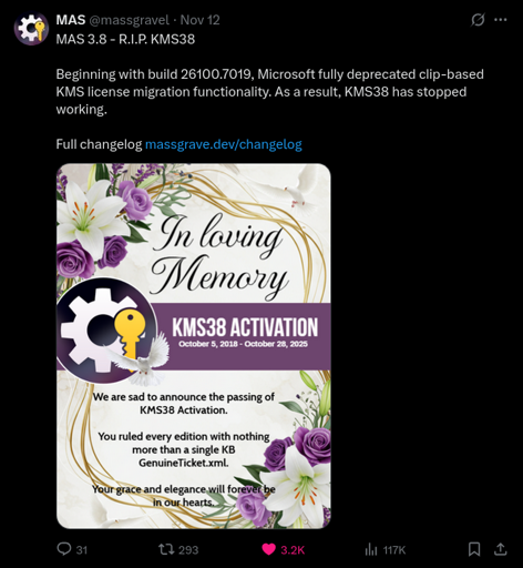 mr_MADAFAKA@lemmy.ml to Piracy: ꜱᴀɪʟ ᴛʜᴇ ʜɪɢʜ ꜱᴇᴀꜱ@lemmy.dbzer0.comEnglish · 12 days agoMicrosoft has blocked Massgrave's KMS38 activation method for Windowslemmy.mlimagemessage-square134linkfedilinkarrow-up1402arrow-down12file-text