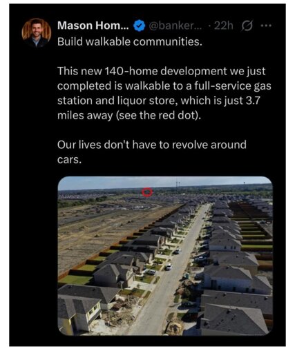 Not a strong example of walkable communities, it’s quite pathetic in fact. Is this satire?