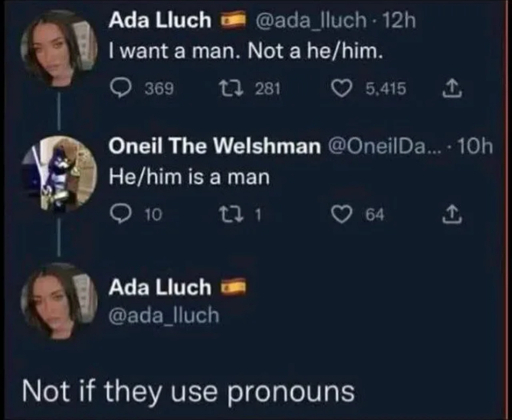 But Ada’s man is a man, and Ada’s man wants to be with Ada. After all, Ada’s man was willing to forgo “his pronoun” for Ada. At least that what Ada’s man has chosen so far.