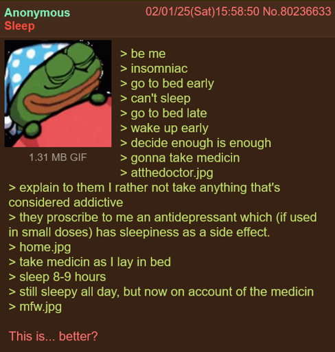 throwawaybanana@discuss.online to Greentext@sh.itjust.works · 10 months agoAnon tries to sleepdiscuss.onlineimagemessage-square2linkfedilinkarrow-up10arrow-down10