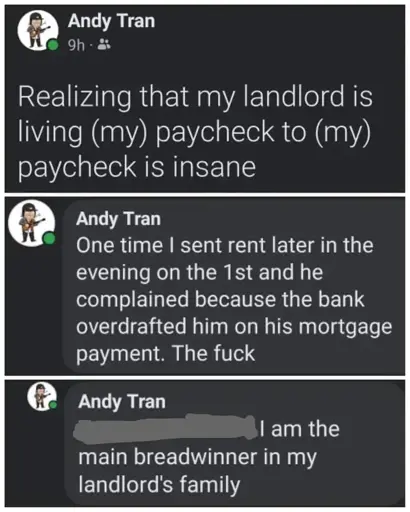 but the decent landlord, holy shit were they ever good. cheap af rent on a long since paid off shitty little house for student housing. actually mowed the lawn. renovated the kitchen one year, like, actually well. not fancy, just well done. pretty sure it was just his last house that they upsized from, so no large portfolio or anything. I’m okay with that.