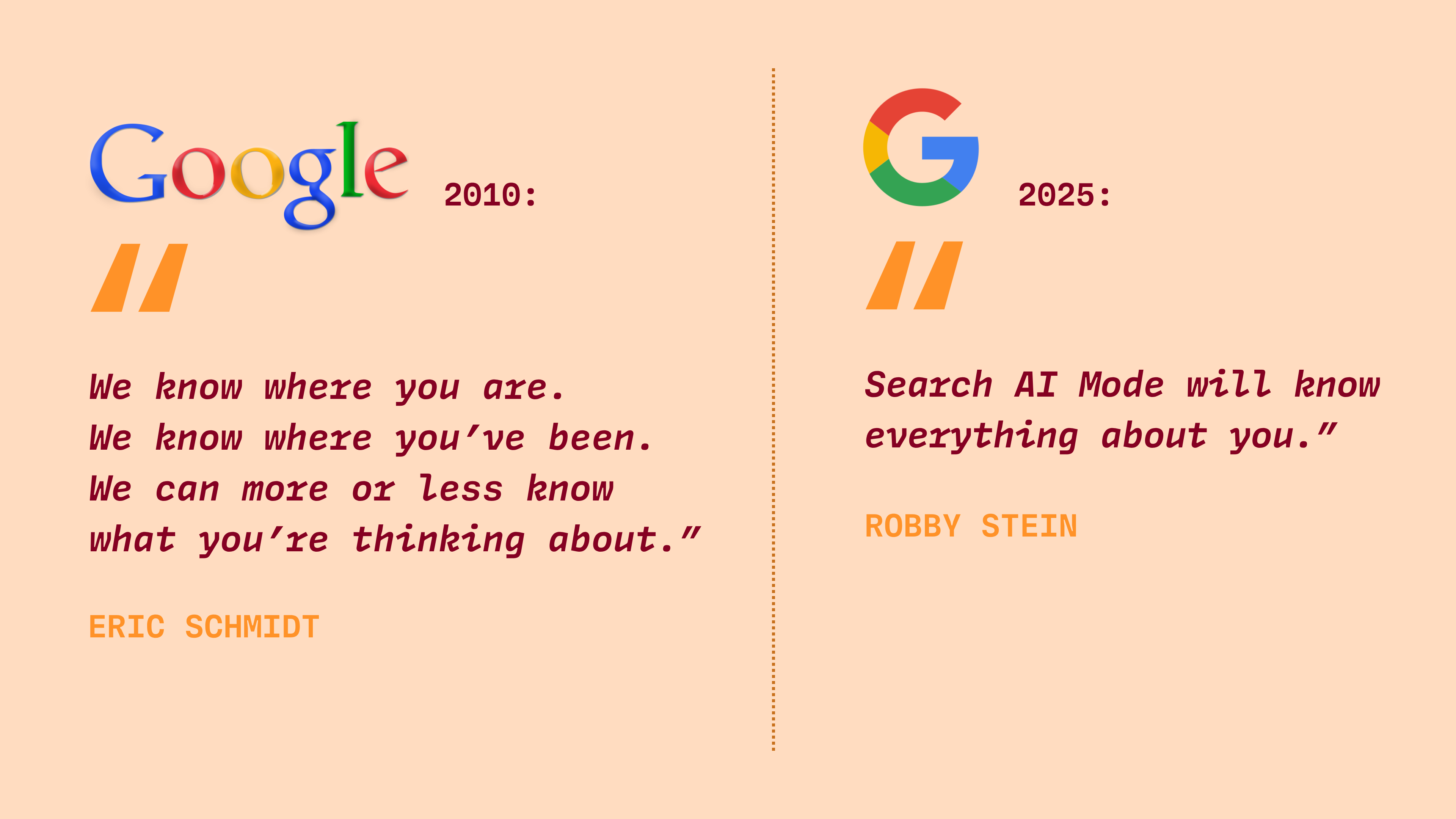 Remember what Google CEO Eric Schmidt said “We can more or less know what you’re thinking about”? This dystopia will now come true with Search AI Mode.