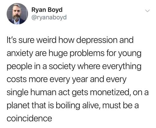 anxiety, depression, and anger are valid responses when first learning about the shithole that America has become. But then you need to push past that to motivate actual action to try to change it.