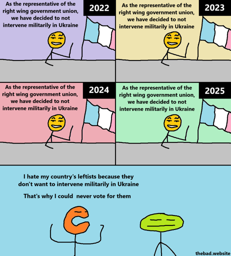 I tend to make conservatives orange these days due to the orange president, but it’s not always the case, just a mood of the moment thing. I like the other commenter’s reply, art is in the eye of the beholder, the colors are whatever you see in them - I probably unconsciously saw something in them when I was making the comic in the first place, you never truly randomly choose things after all.