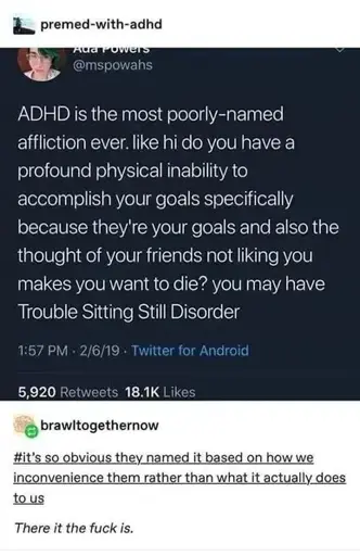 compostgoblin@lemmy.blahaj.zone to ADHD memes@lemmy.dbzer0.comEnglish · 2 months agoAh yes, the trouble sitting still disorderlemmy.blahaj.zoneimagemessage-square0linkfedilinkarrow-up11arrow-down10